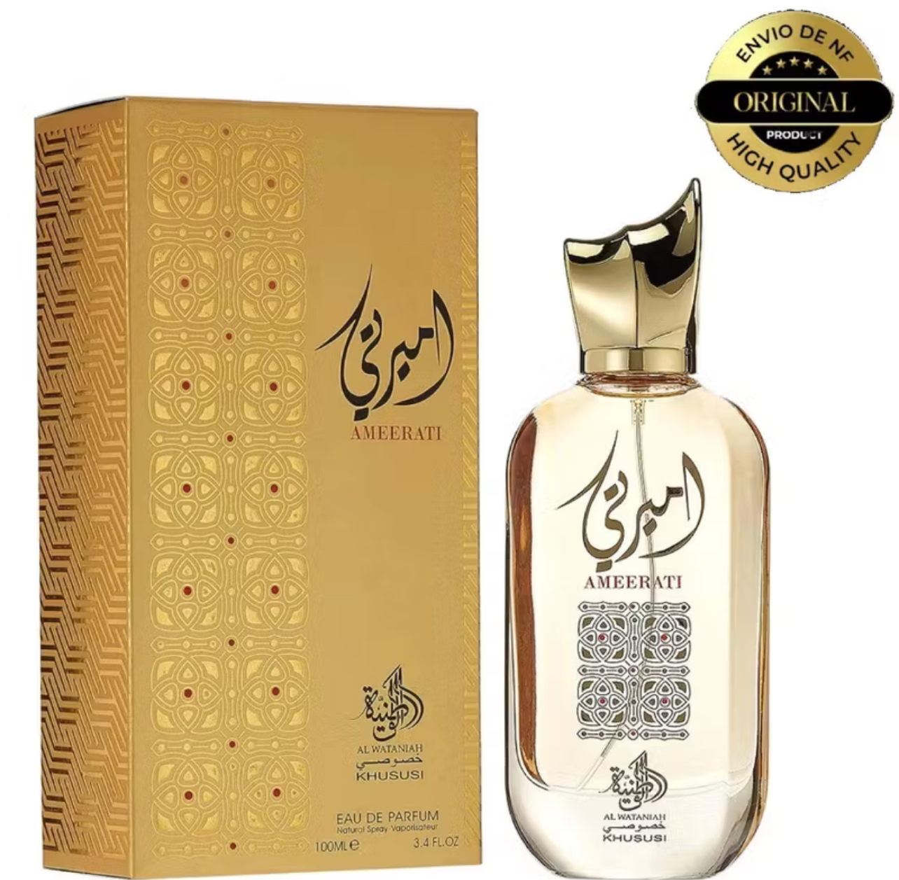 Ameerati Eau De Parfum de Al Wataniah Khususi com notas cítricas e almíscar complementadas por aromas frescos e amadeirados. Este perfume traz para você a experiência autêntica de ser um verdadeiro Emirati enquanto este perfume envolve você e o anima, mostrando seus sonhos de areia dourada.